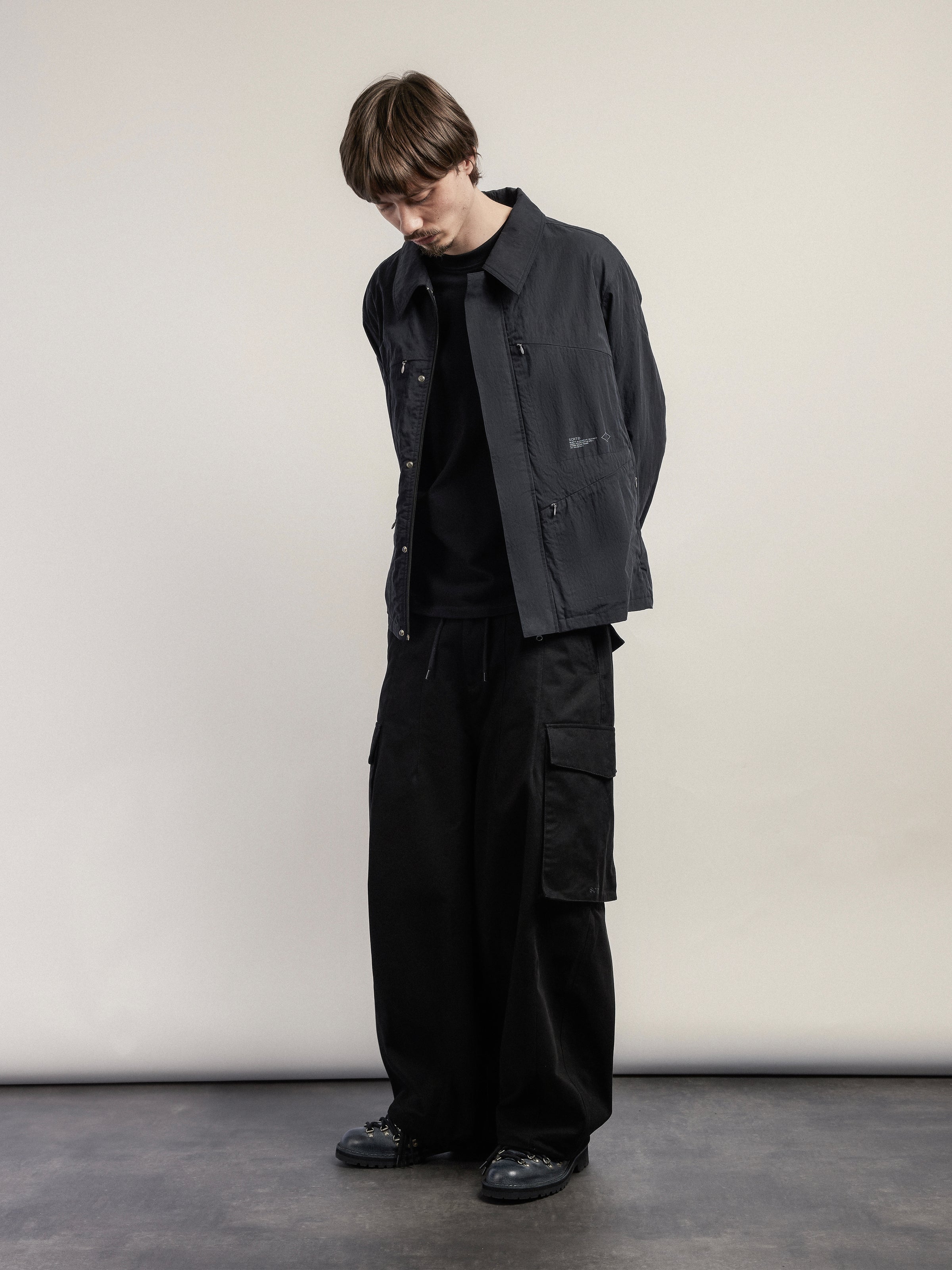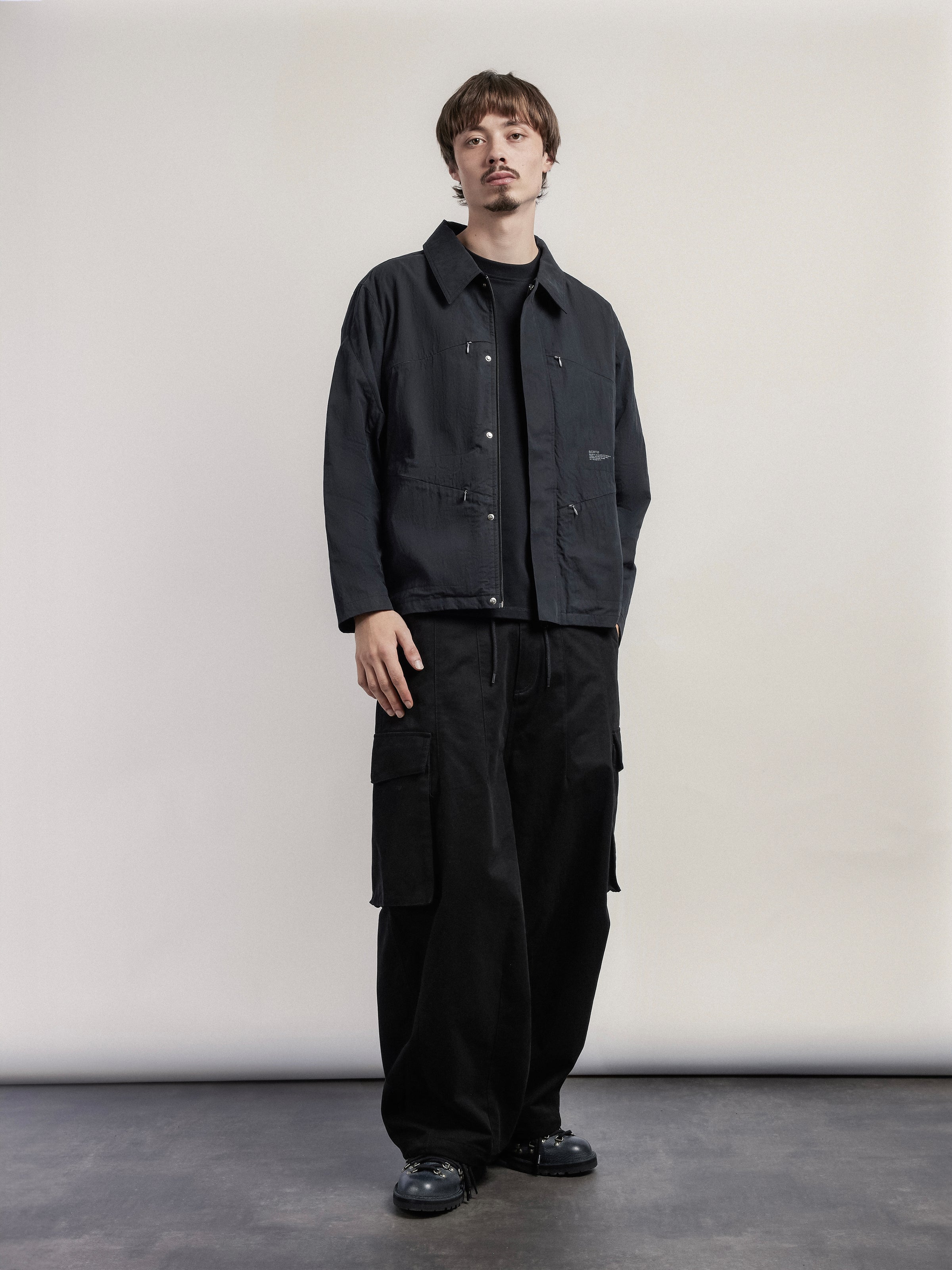The Robeson Technical Shirt is constructed from a nylon (15%) and cotton (85%) blend, offering durability, breathability, and a lightweight structure. It features invisible zipped pockets with contrast pullers designed to resemble mechanical toggles often seen in science fiction utility gear.