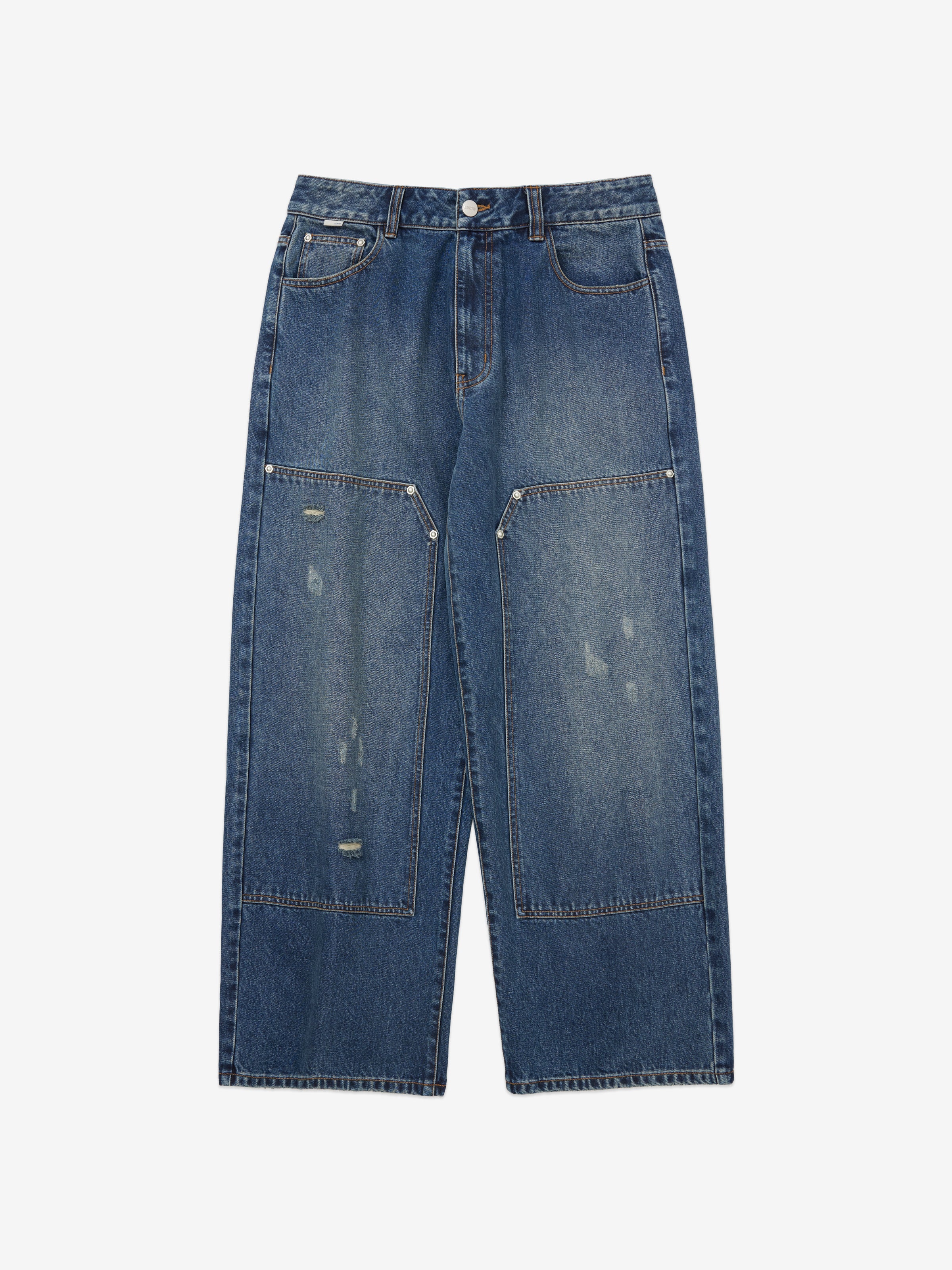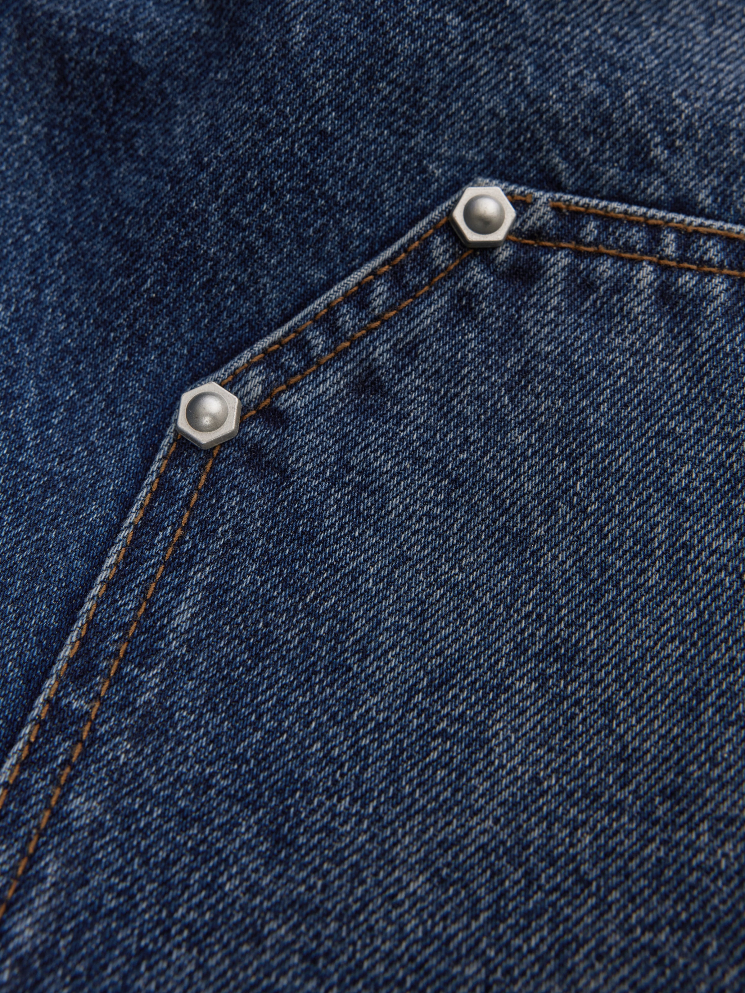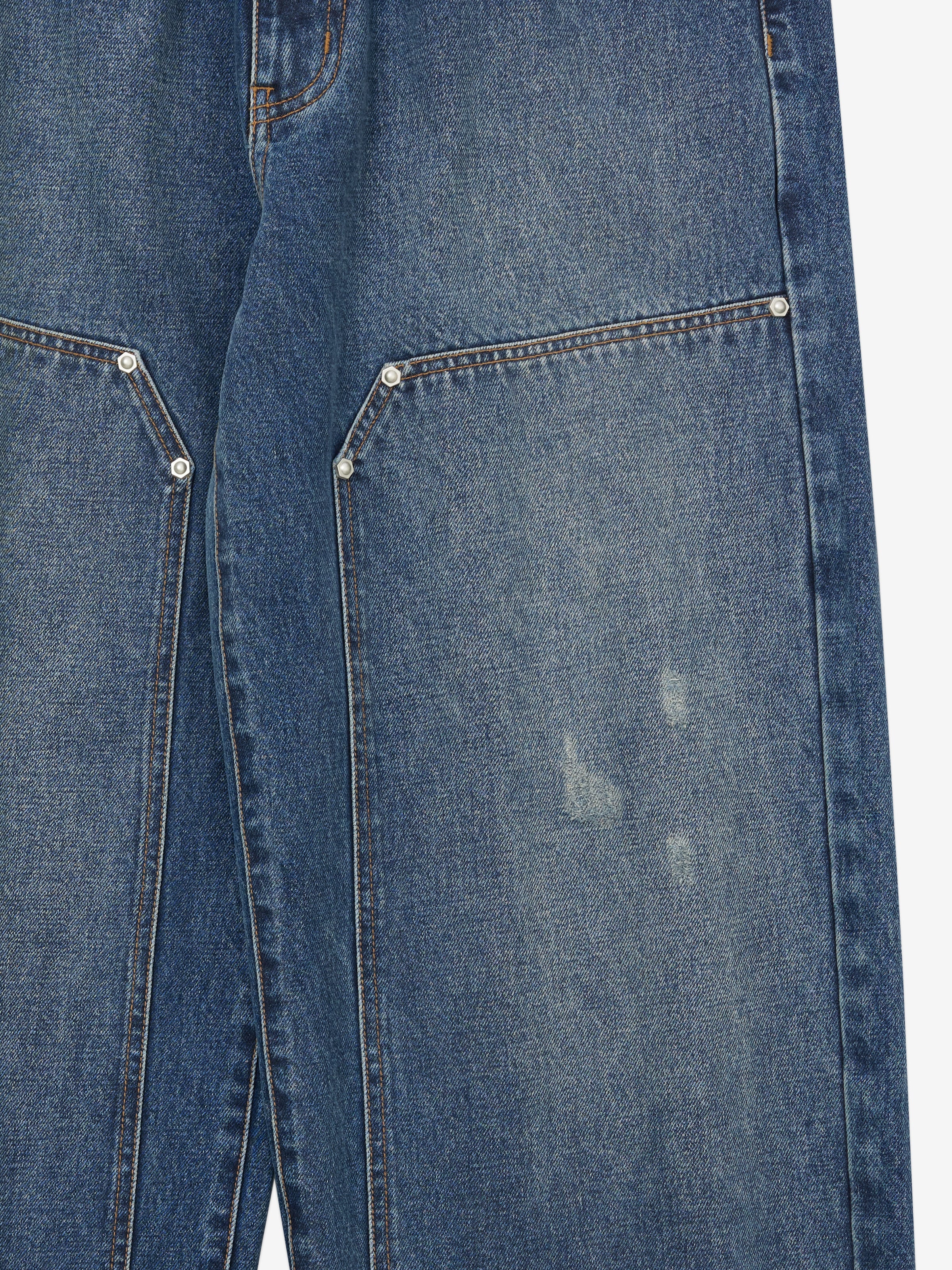 The jeans feature double knee reinforcement for added durability, built to withstand repeated wear. Small hand-distressed details are applied throughout, enhancing the lived-in feel. The jeans are finished with custom hex bolt rivets details, SCRT® metal shank buttons, and a leather debossed back patch.