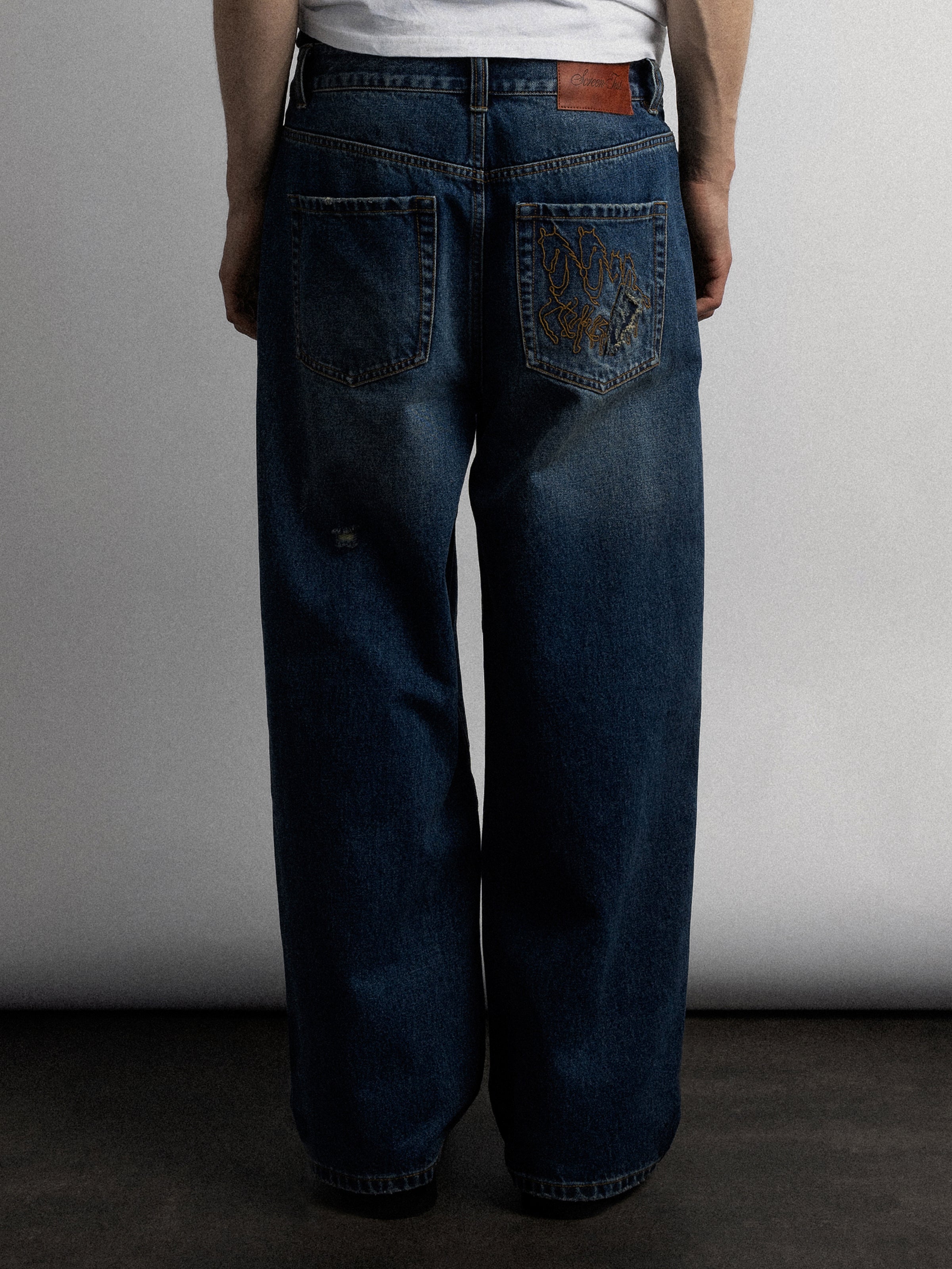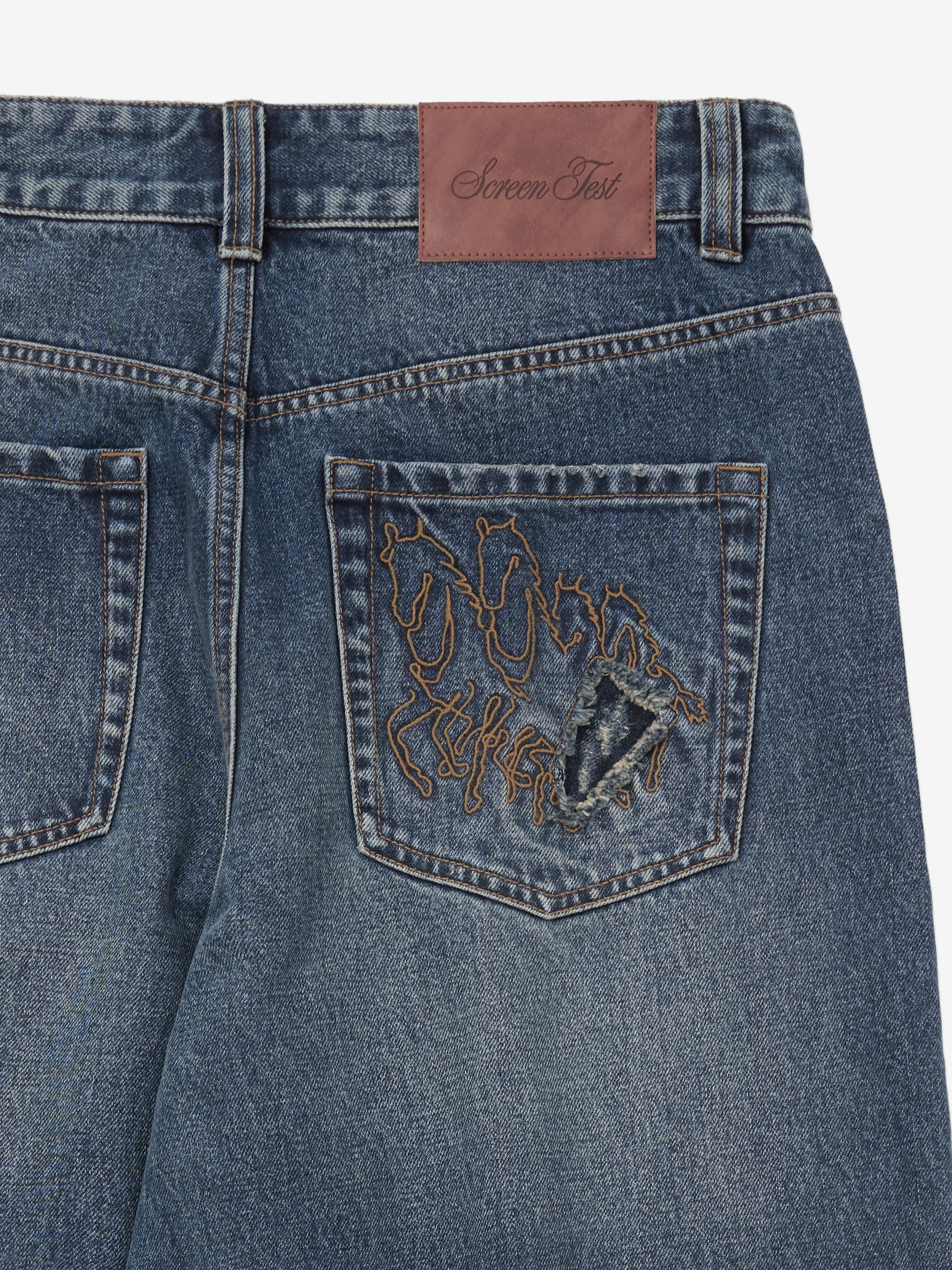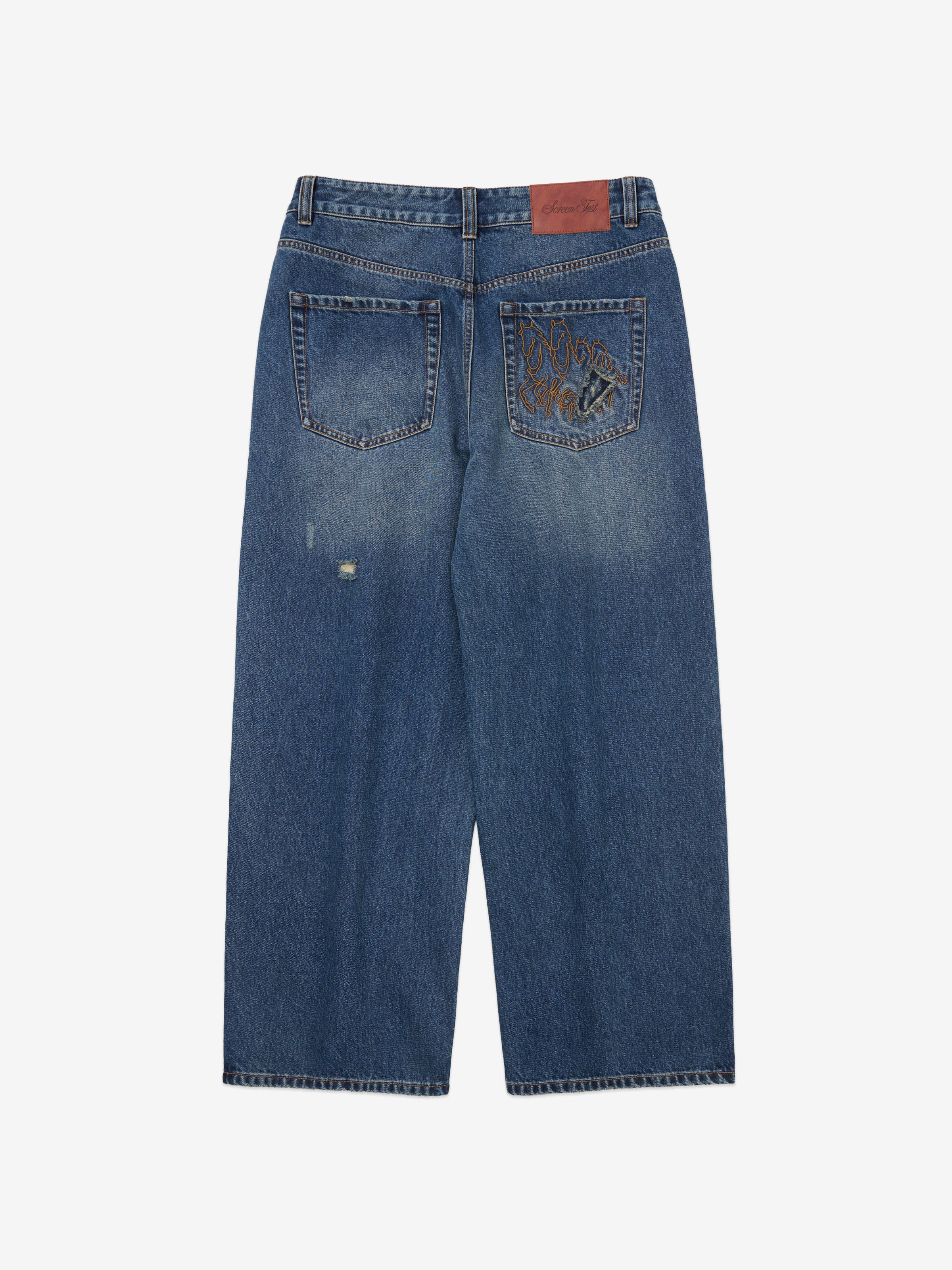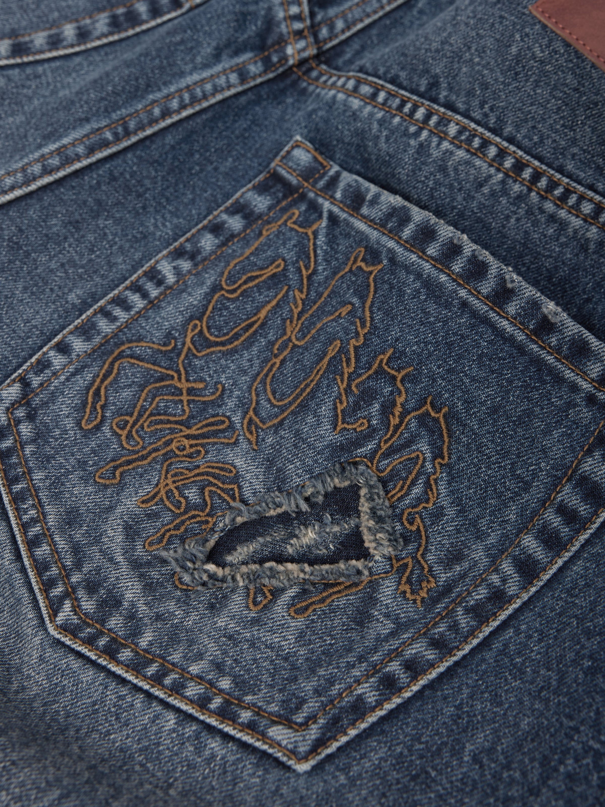 The jeans feature double knee reinforcement for added durability, built to withstand repeated wear. Small hand-distressed details are applied throughout, enhancing the lived-in feel. The jeans are finished with custom hex bolt rivets details, SCRT® metal shank buttons, and a leather debossed back patch.