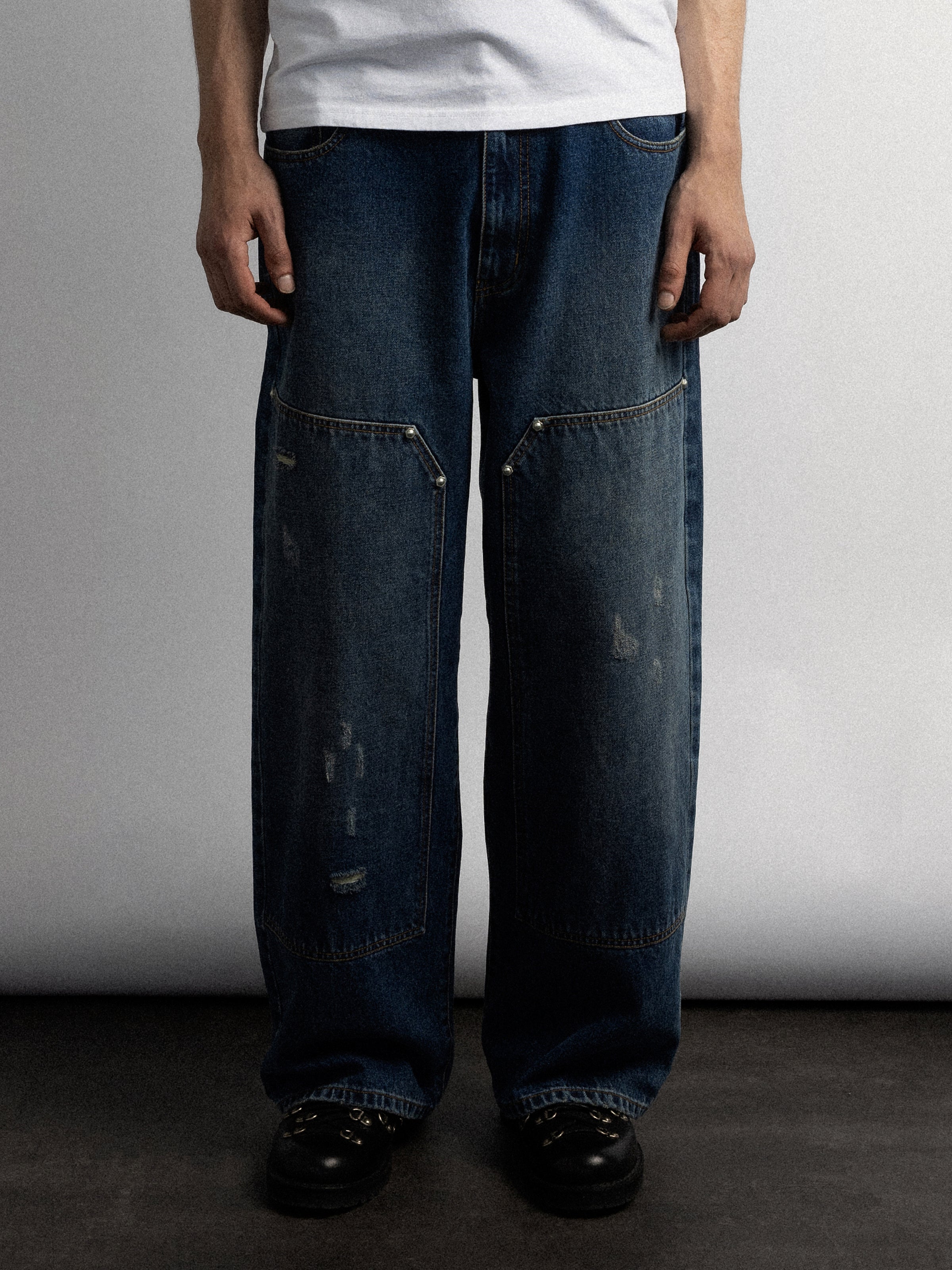 The Wayfarer Double Knee Jeans in Washed Indigo are made from our usual 13oz 100% cotton denim. Finished with a mid-blue natural wash that gives a worn-in, time-softened appearance.