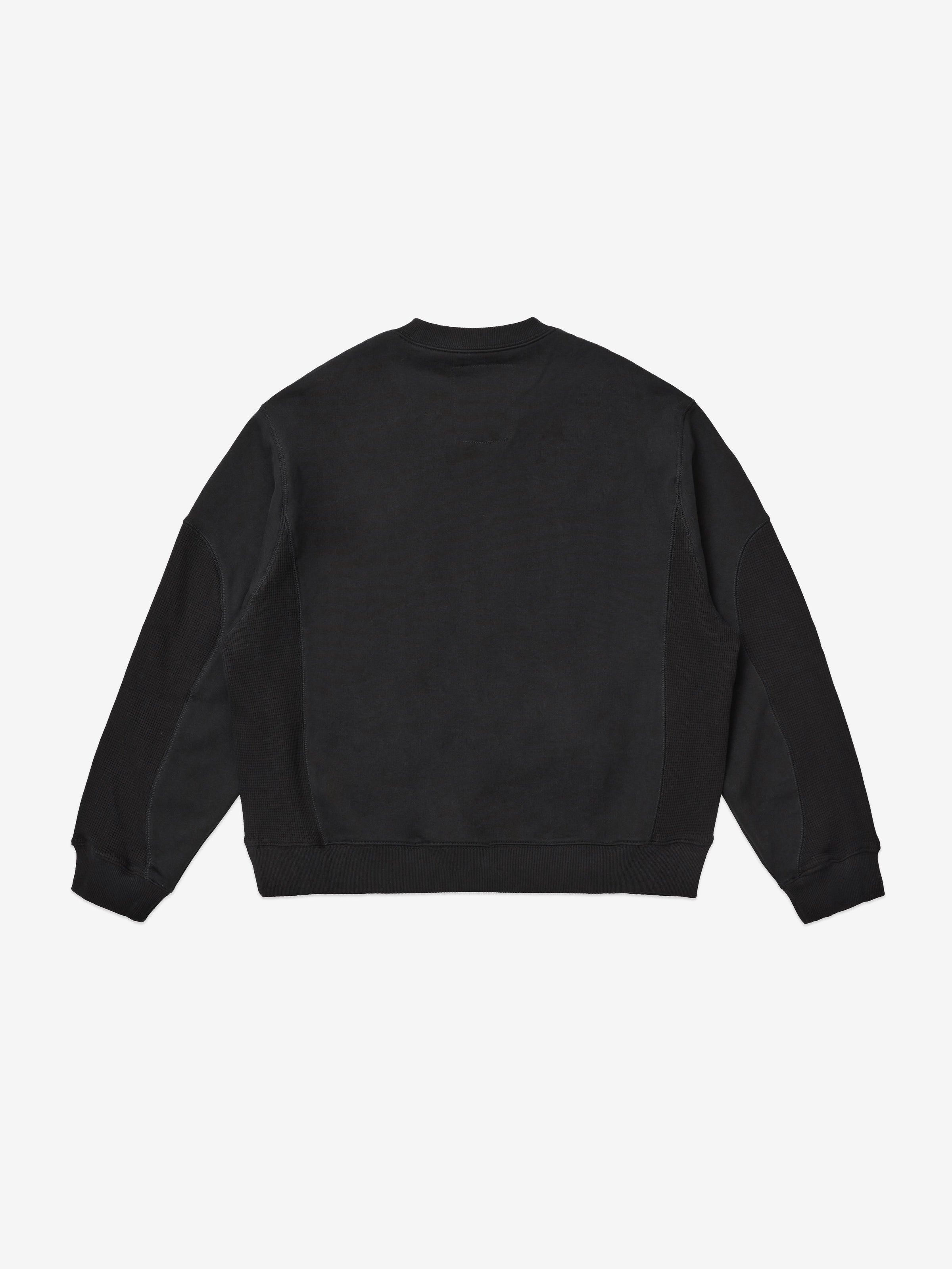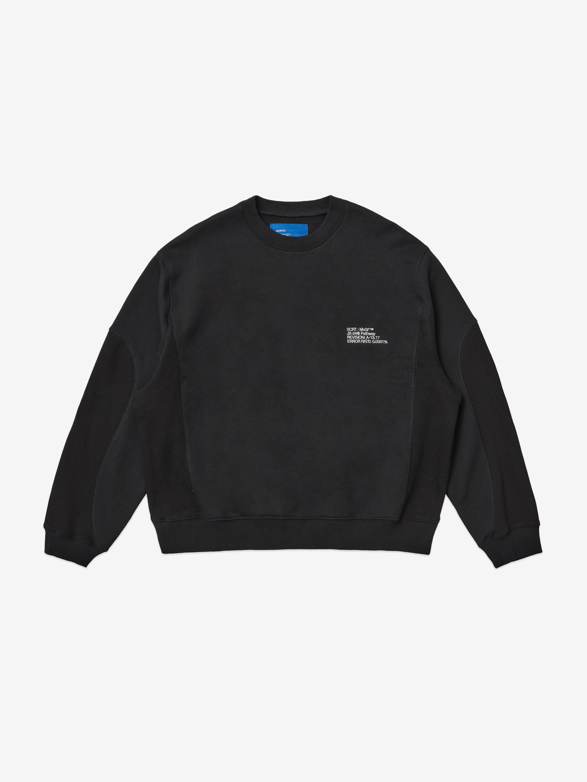 The MoSF Fragment Sweat is made from 480GSM brushback cotton fleece with 430GSM heavyweight cotton waffle sections. Designed with a boxy fit, it features ribbed cuffs and waistband and an embroidered chest graphic. The contrast between the fleece and the waffle textures mirrors the blend of organic and engineered forms found in imagined futures.