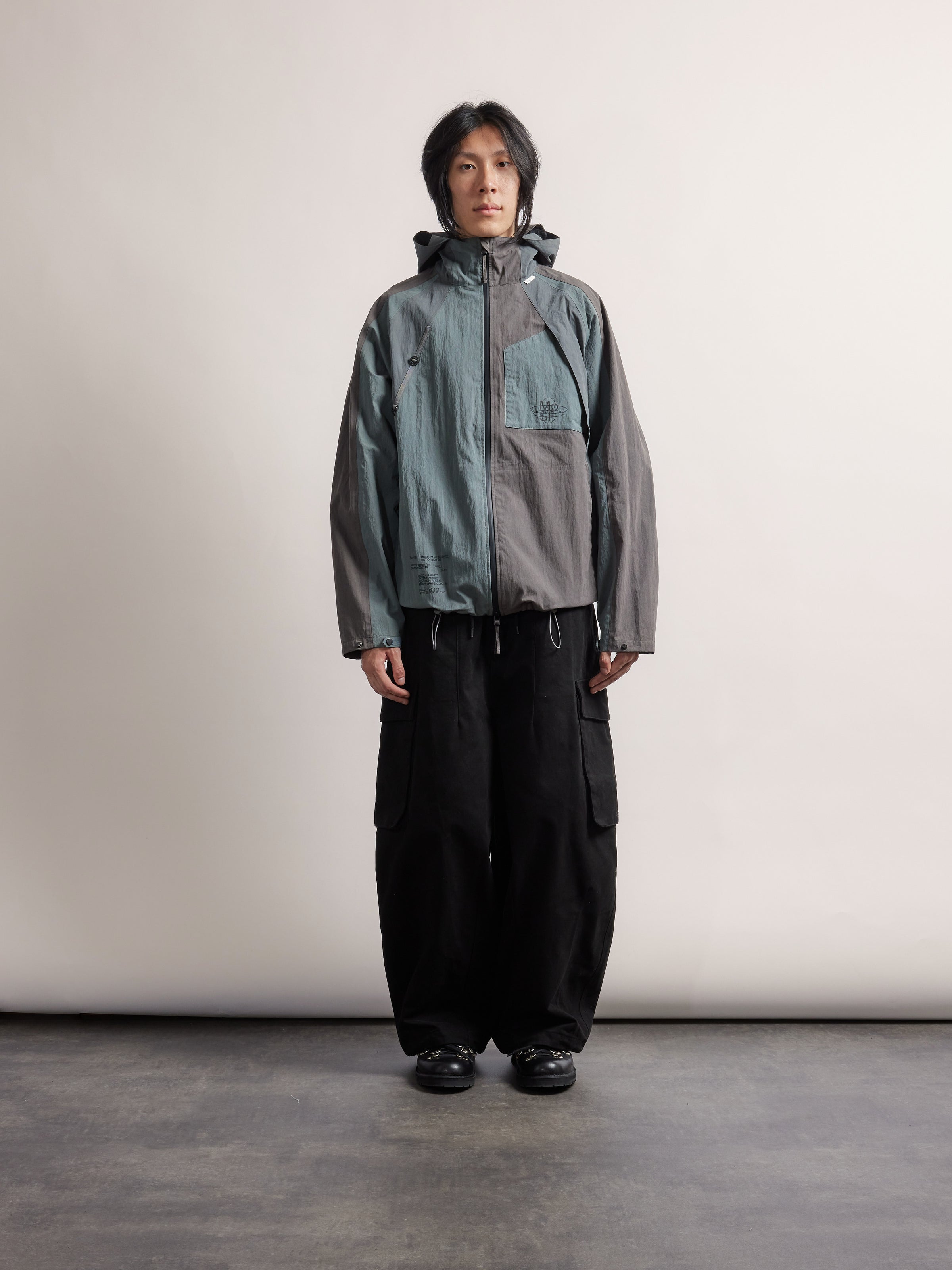 The Test Pattern Jacket is made from a nylon/cotton blend with fully taped seams to ensure wind protection, durability, and breathability. It features a peaked hood, zipped pockets, and an adjustable hem and cuffs for functional fit. Finished with raised MoSF vinyl branding on the chest and stomach.