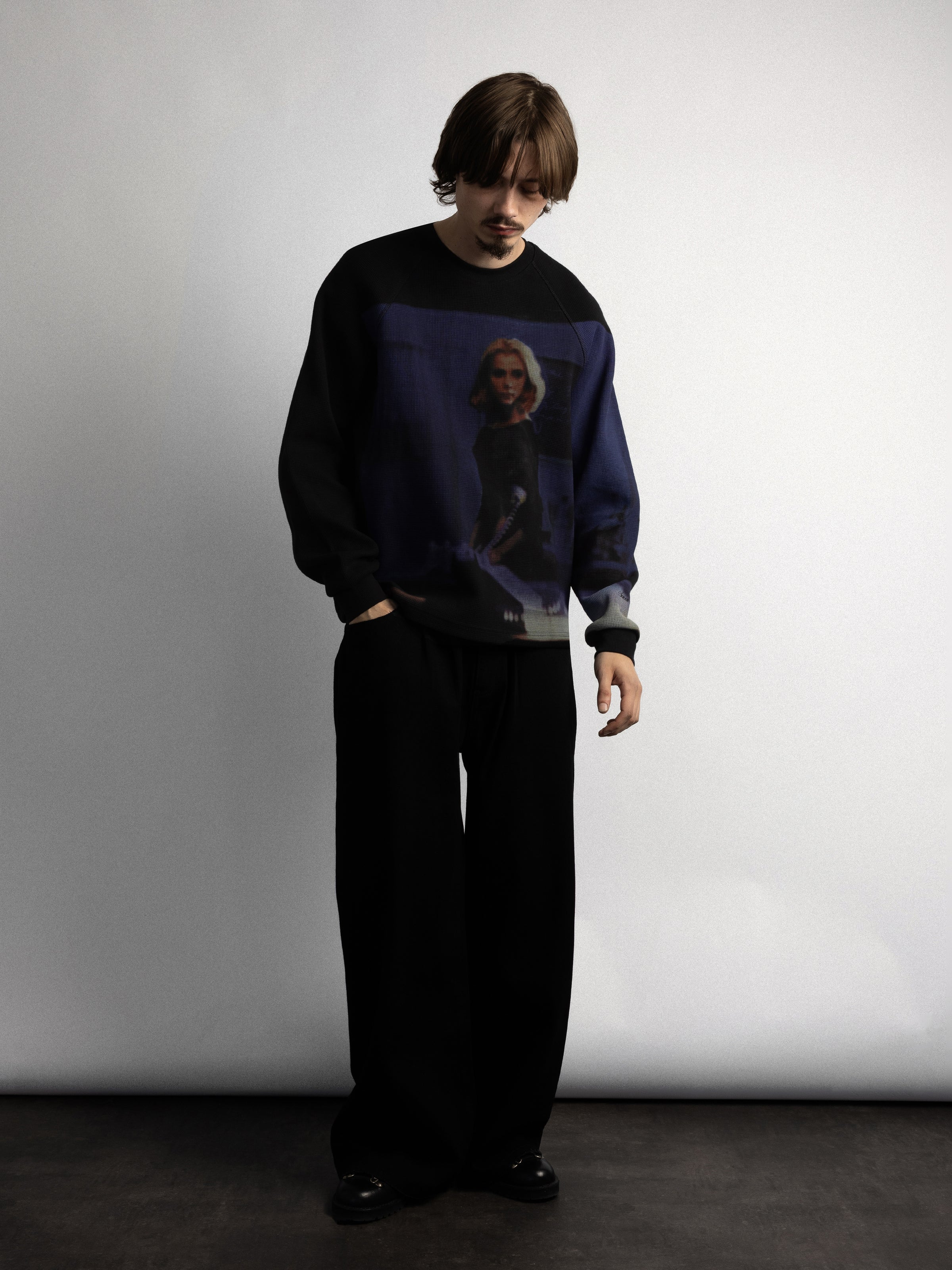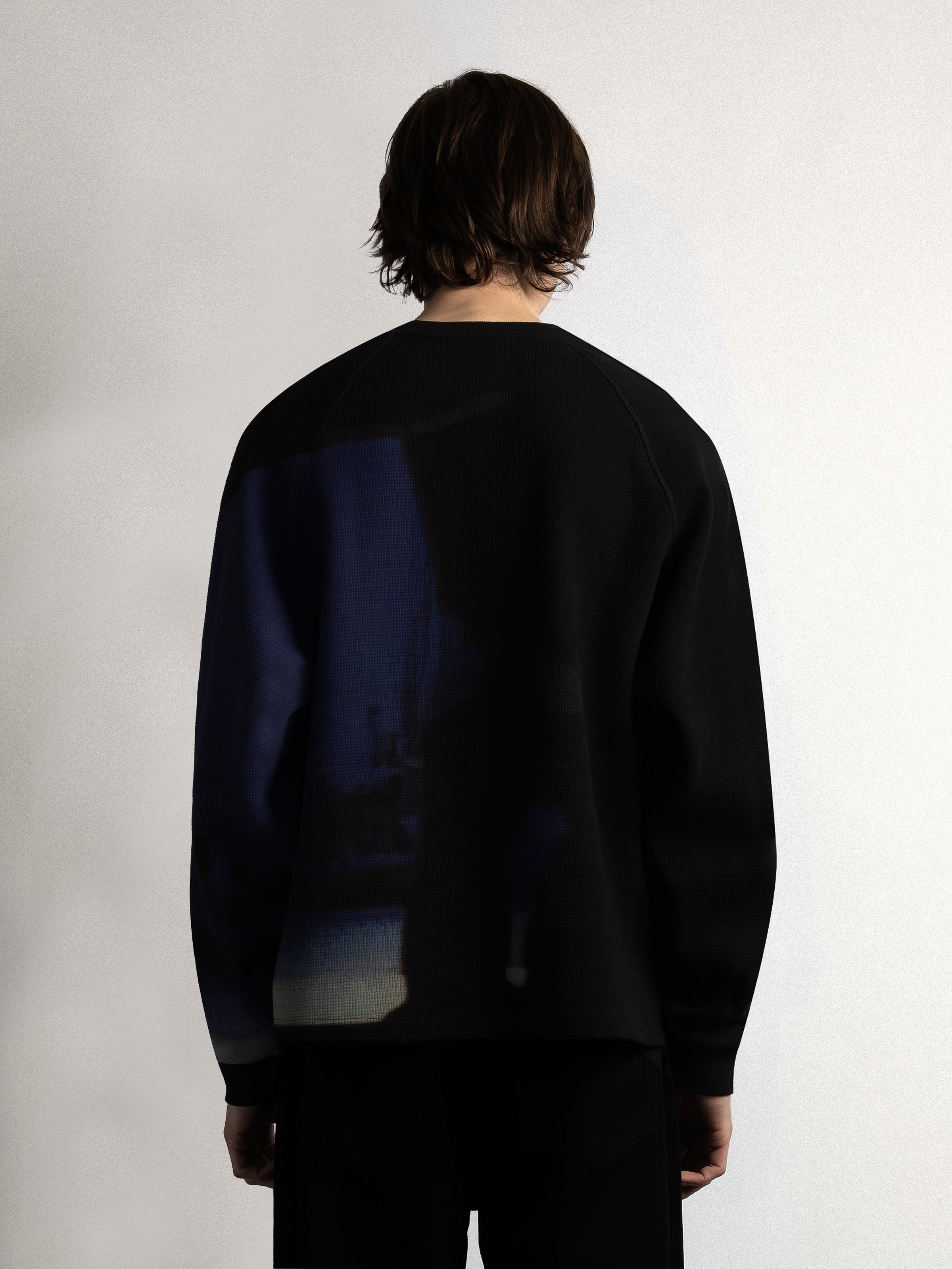 The Confession Thermal Sweat is made from a 450gsm super-heavy cotton waffle fabric with an off centre displaced print.