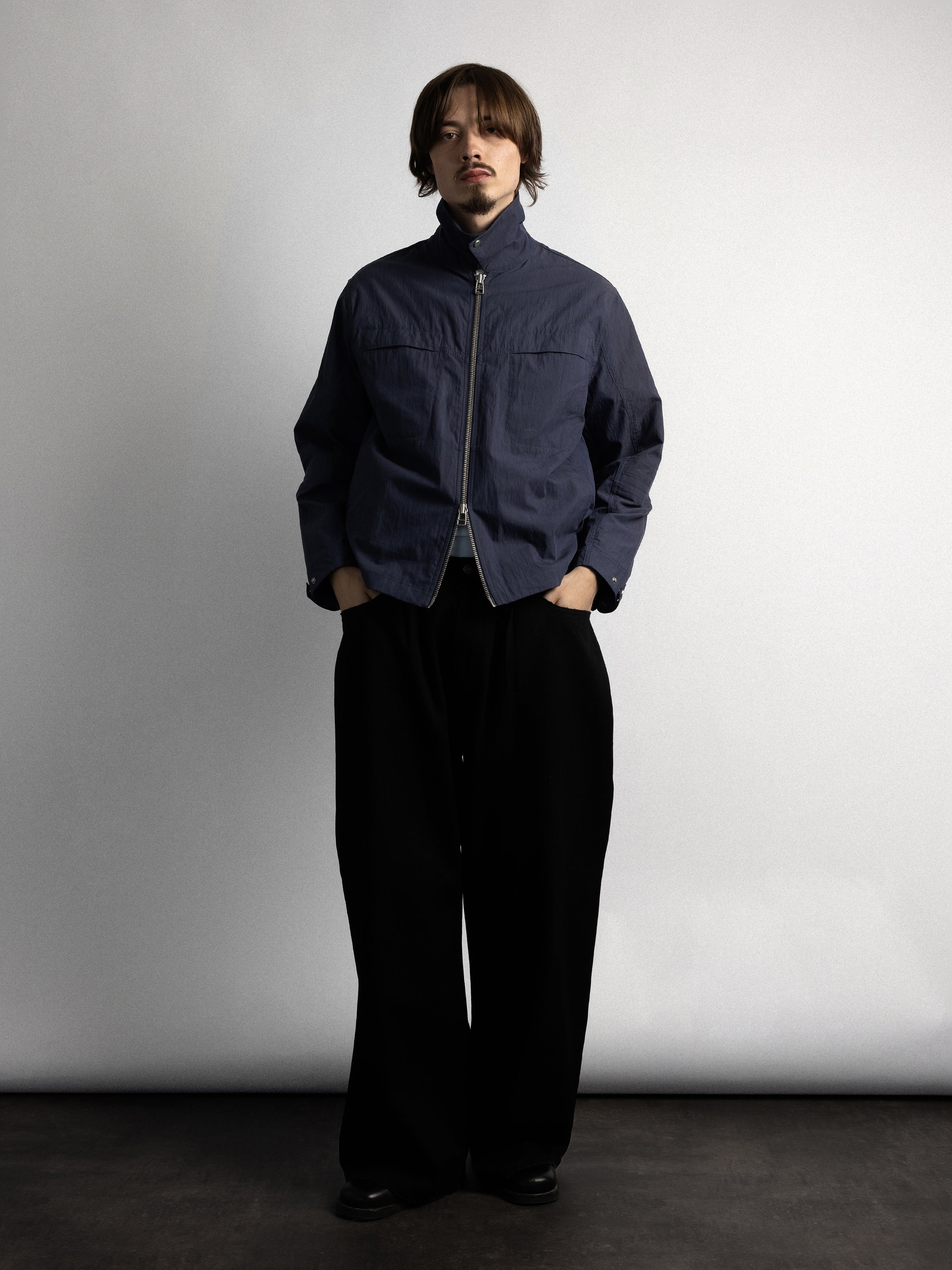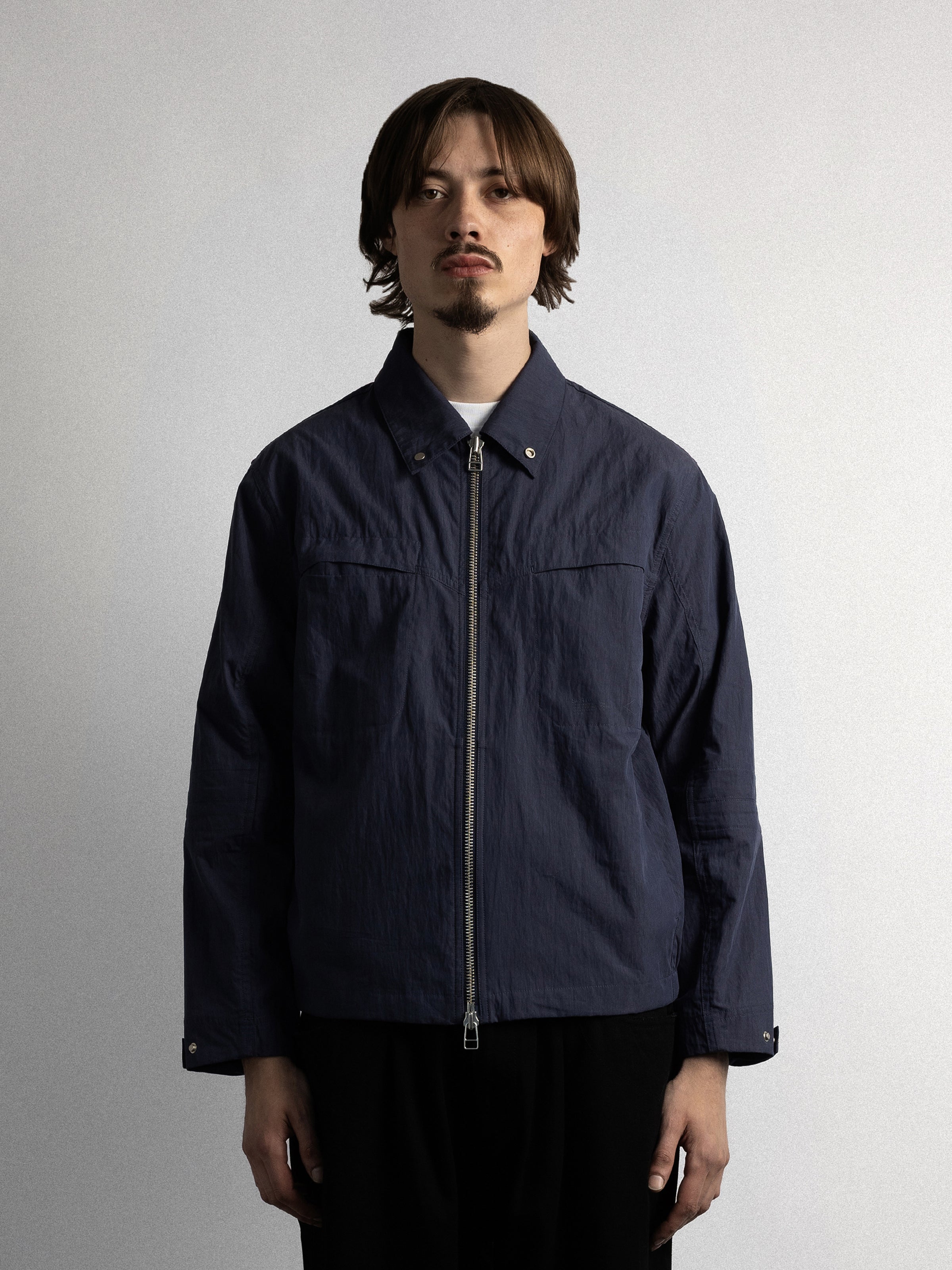 The overshirt features a split elbow system, allowing unrestricted movement through the elbows. A back ventilation panel improves airflow, while a double zip closure allows for adjustable styling. A snap closure collar enables a high-neck fit for added coverage.
