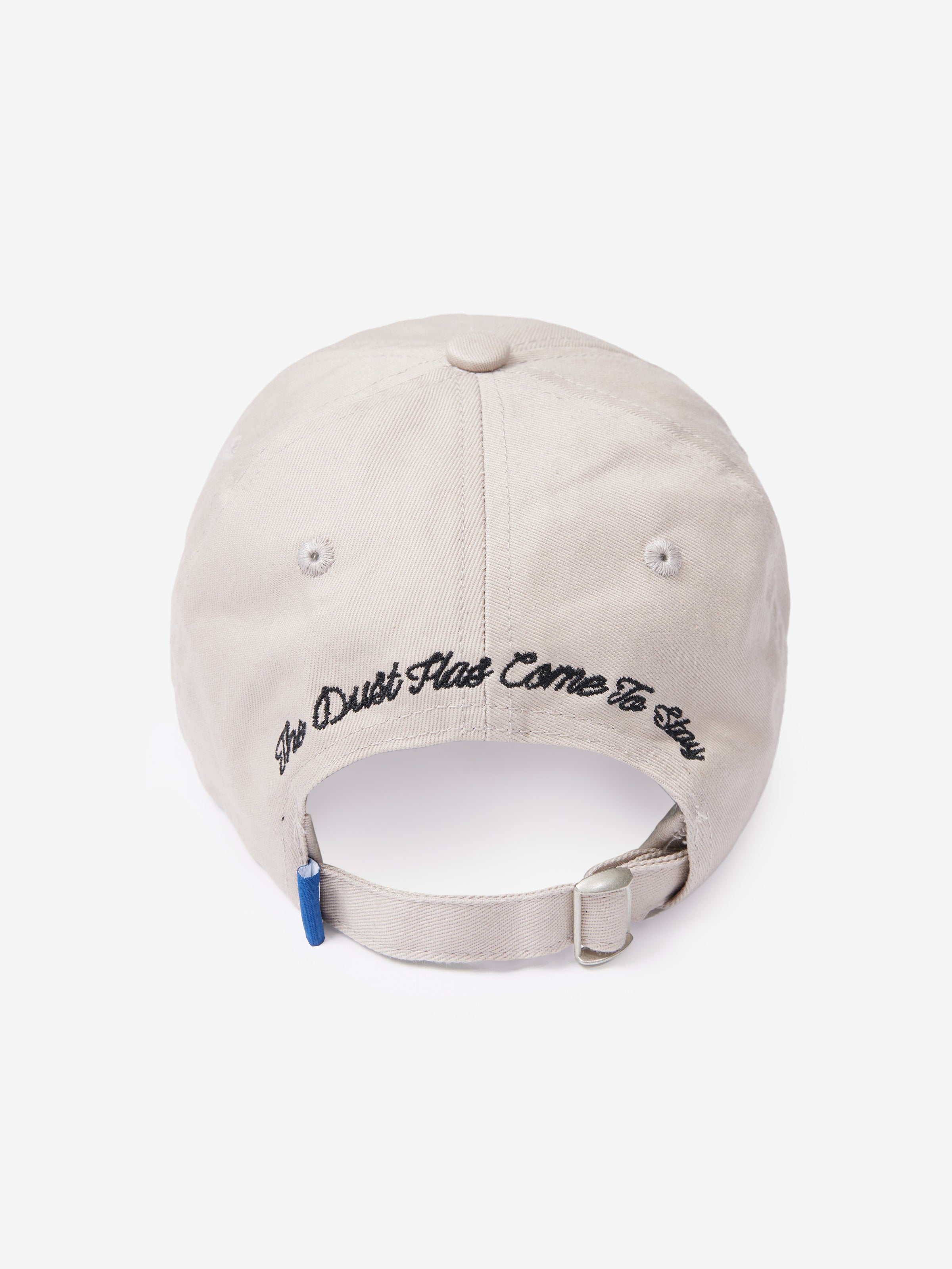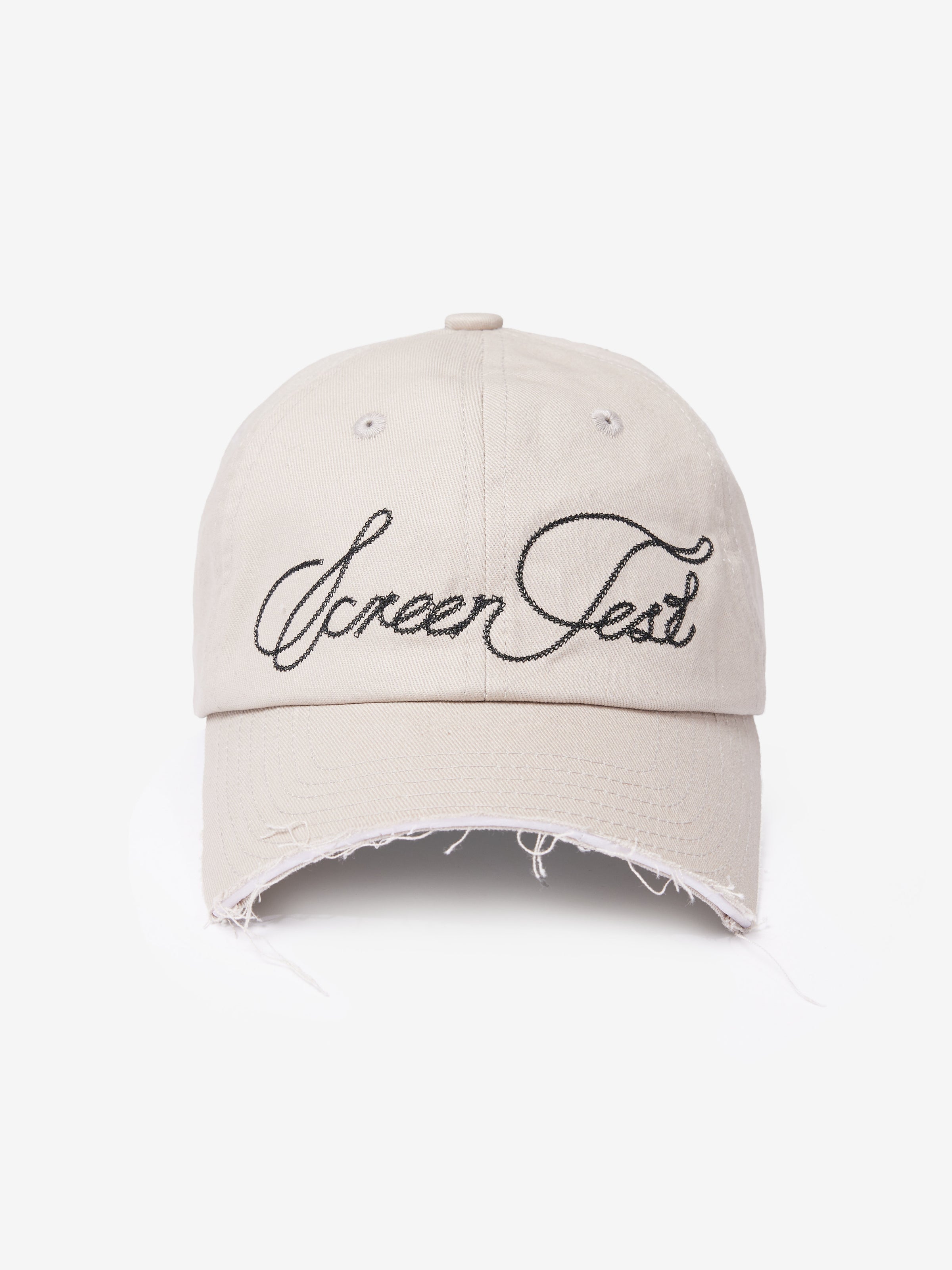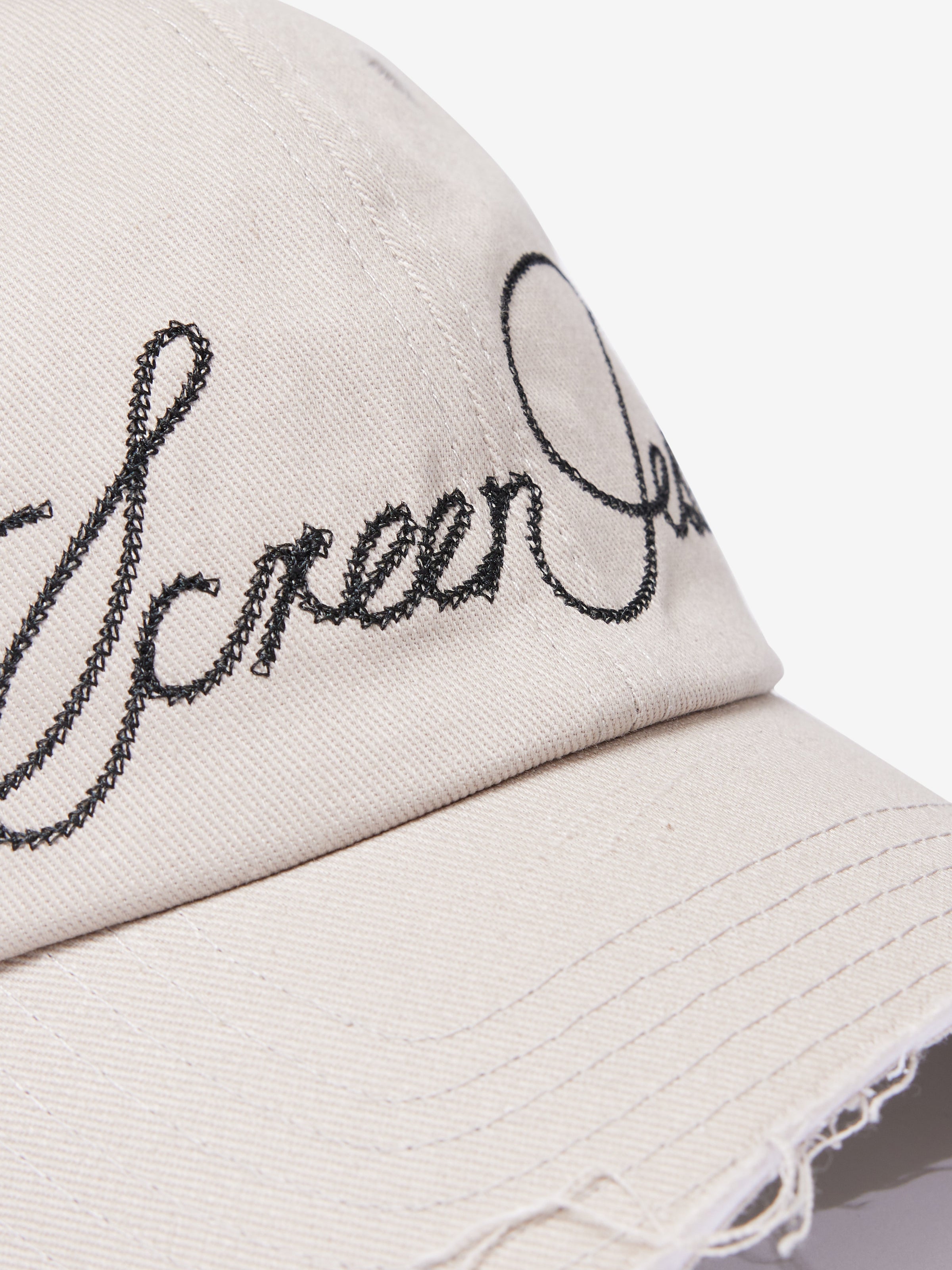 This cap features a shortened cut-brim with distressed detailing. Chain stitch embroidered text is applied to the front, with additional embroidery at the back.