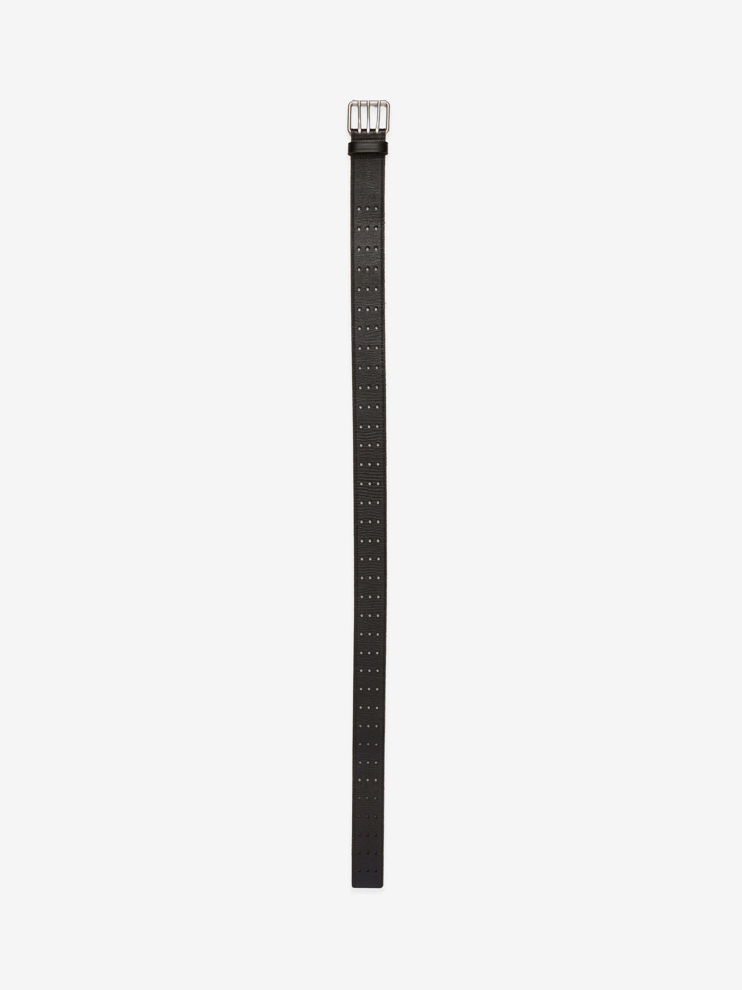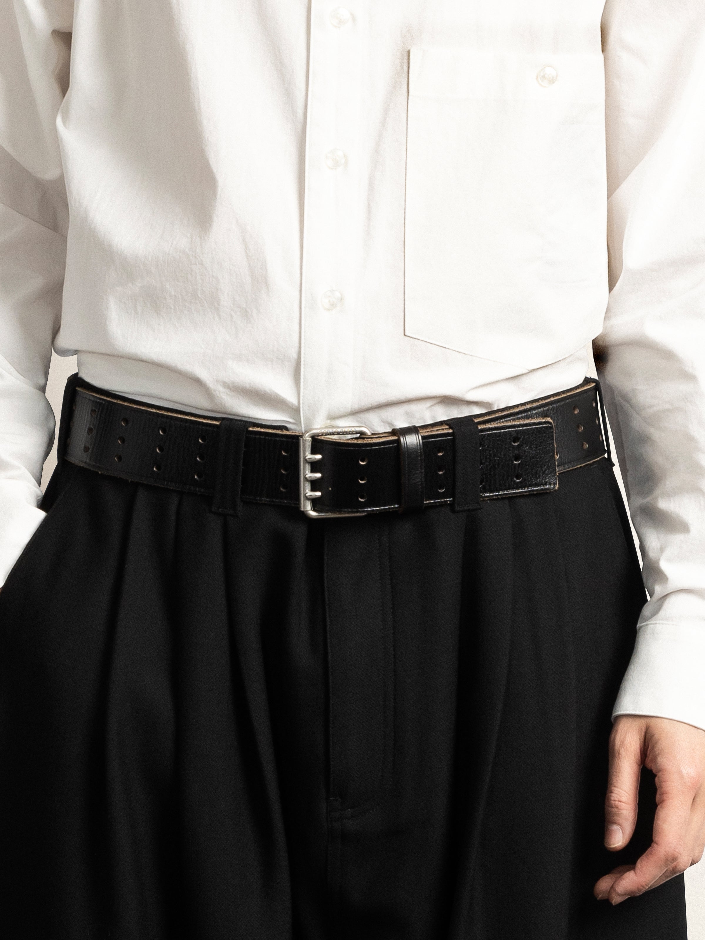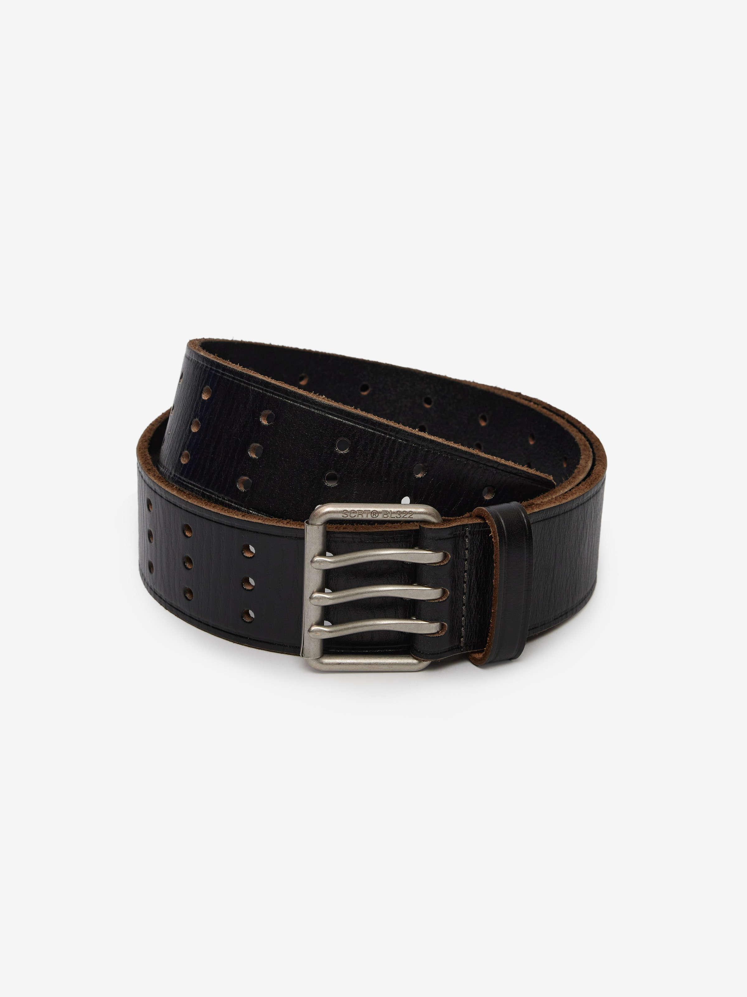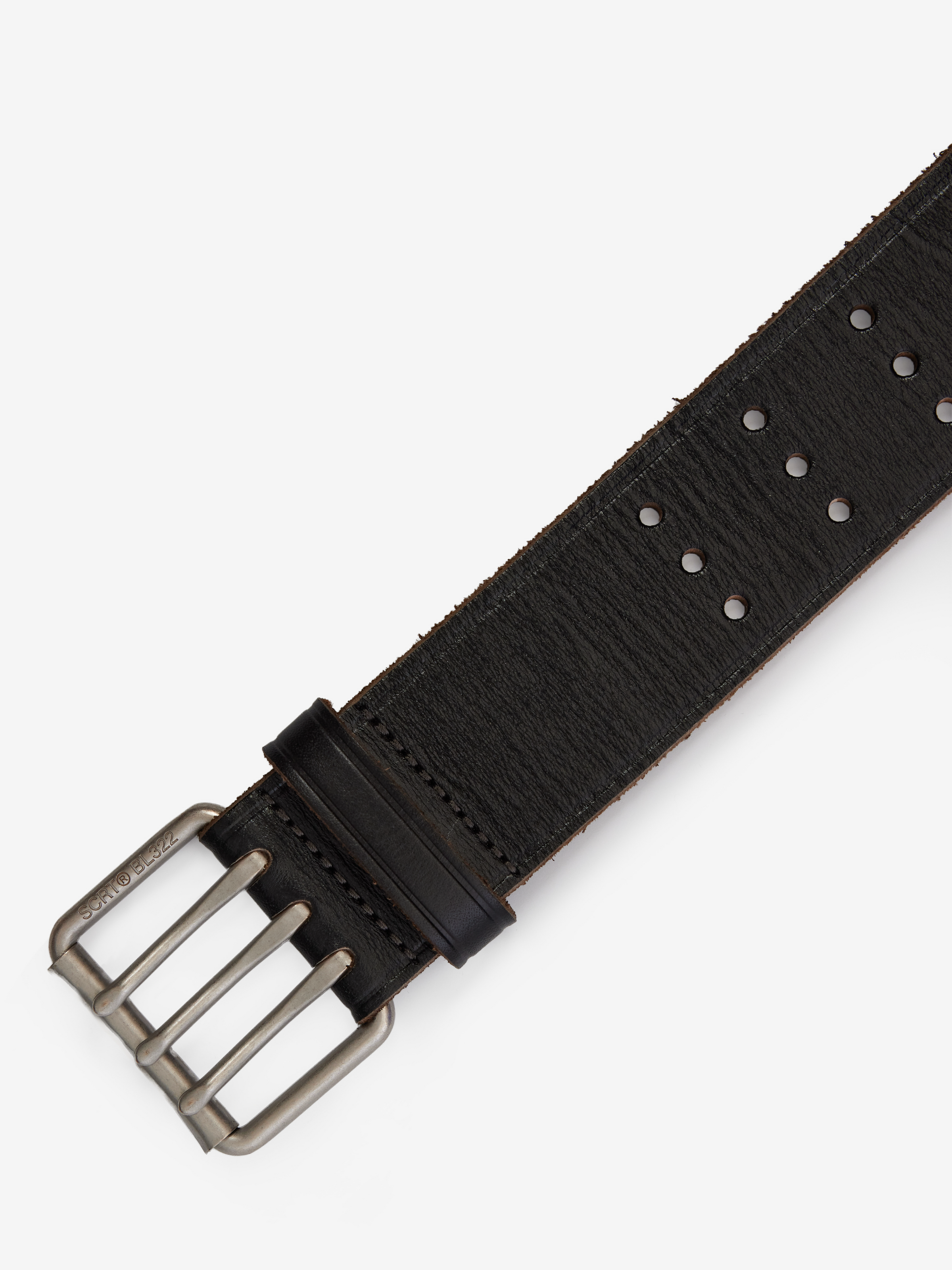 The BL322 belt is crafted from vintage full-grain calf leather and a custom moulded triple-prong buckle in matte silver.