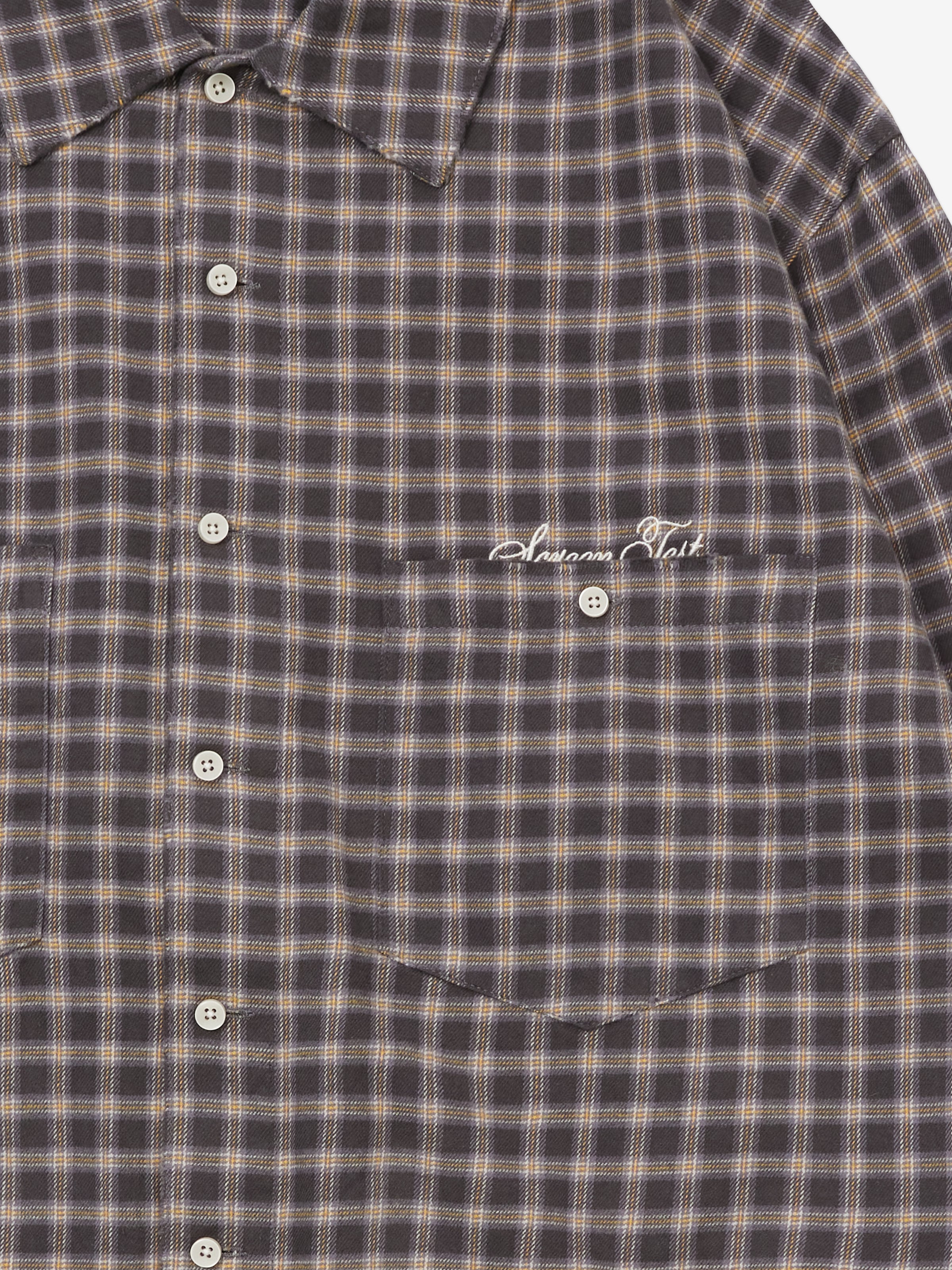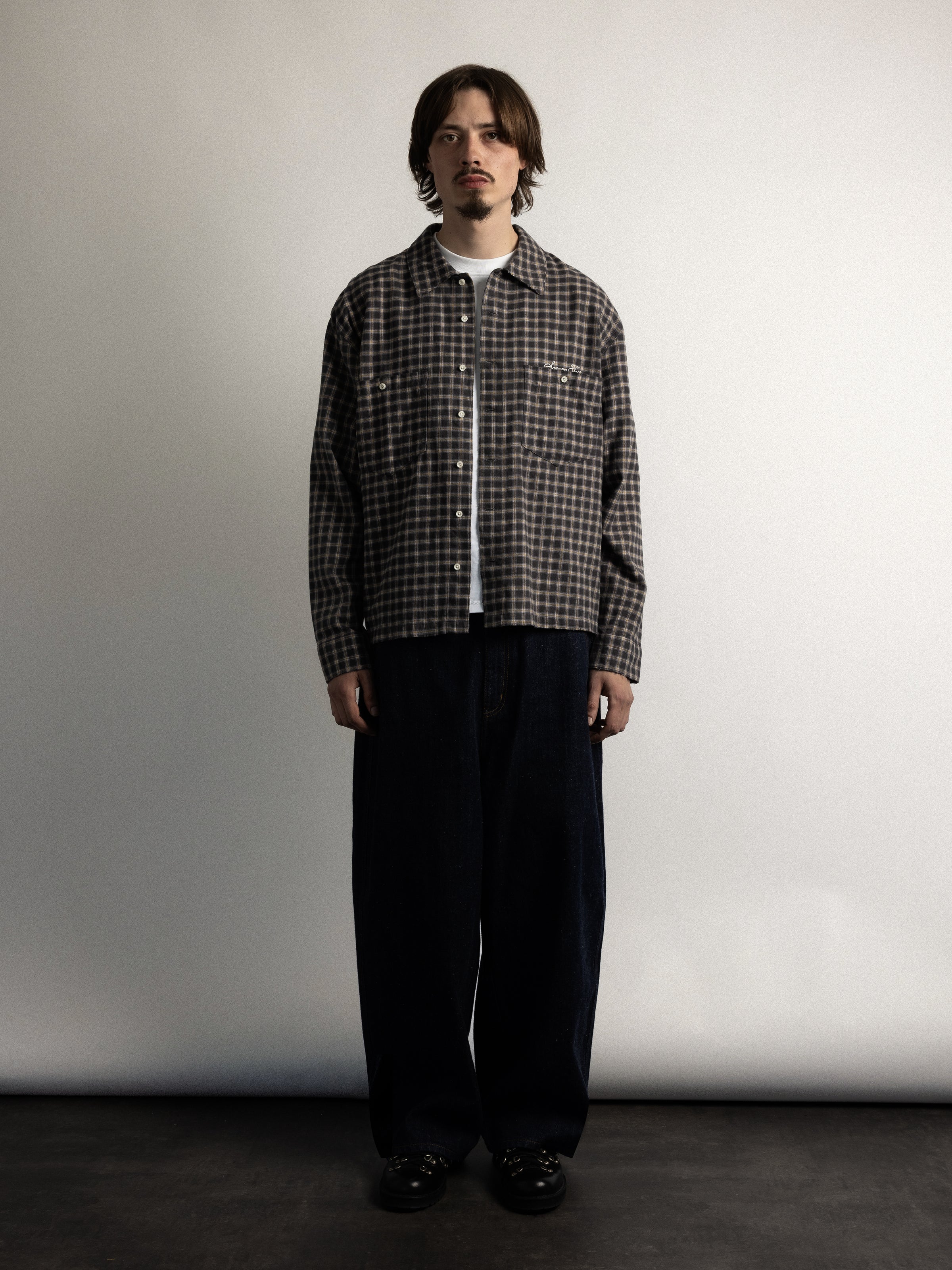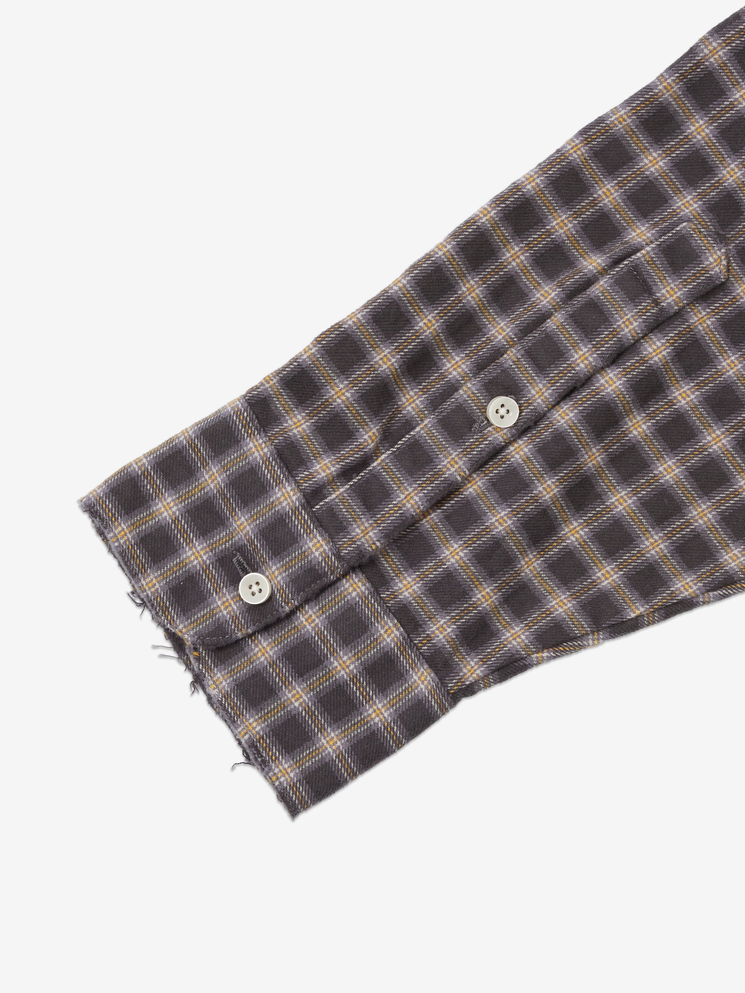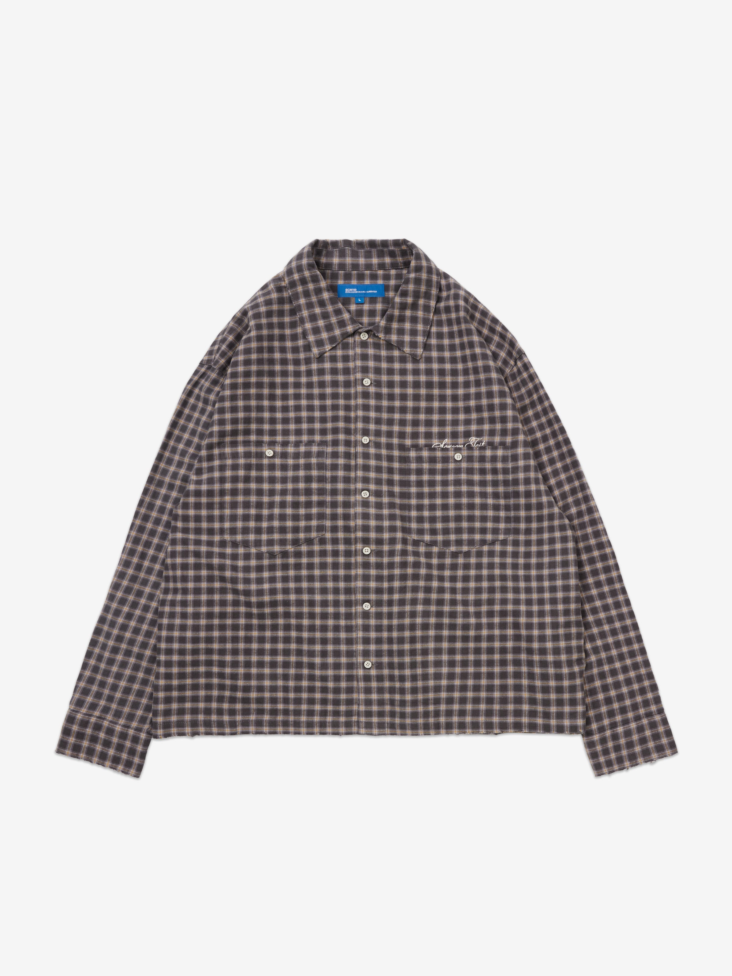 The Distressed Plaid Shirt is made from a woven 160gsm brushed cotton. The shirt features gentle distressing at the hems and collar, a seven-button closure with engraved buttons, and small chest embroidery.