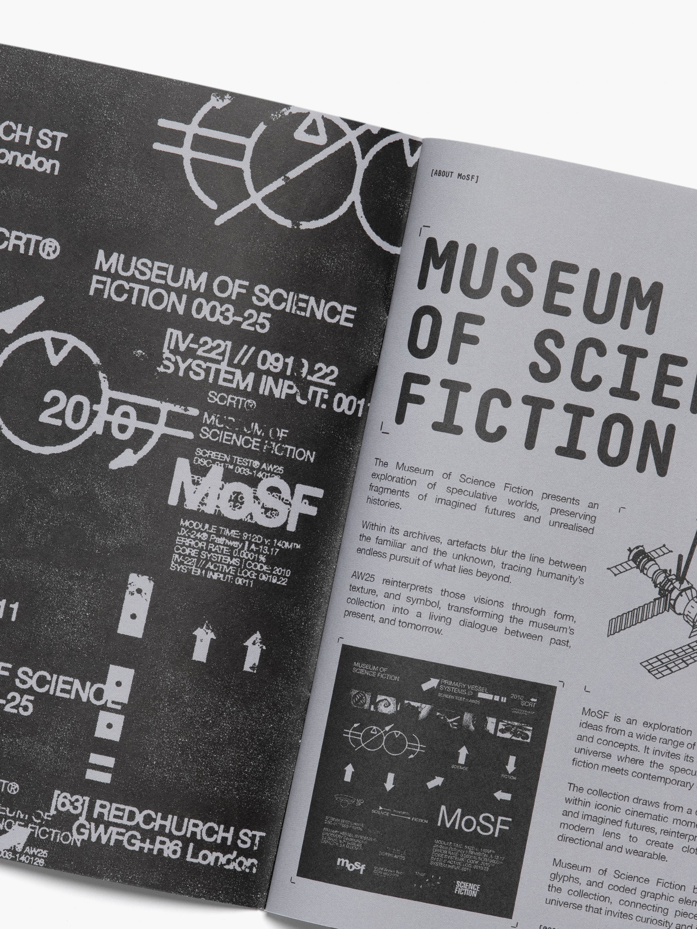 Designed exclusively for the SCRT® x NOTHING AW25 concept space, explaining the origins of the Museum of Science Fiction. A journey through time, preserving fragments of imagined futures.