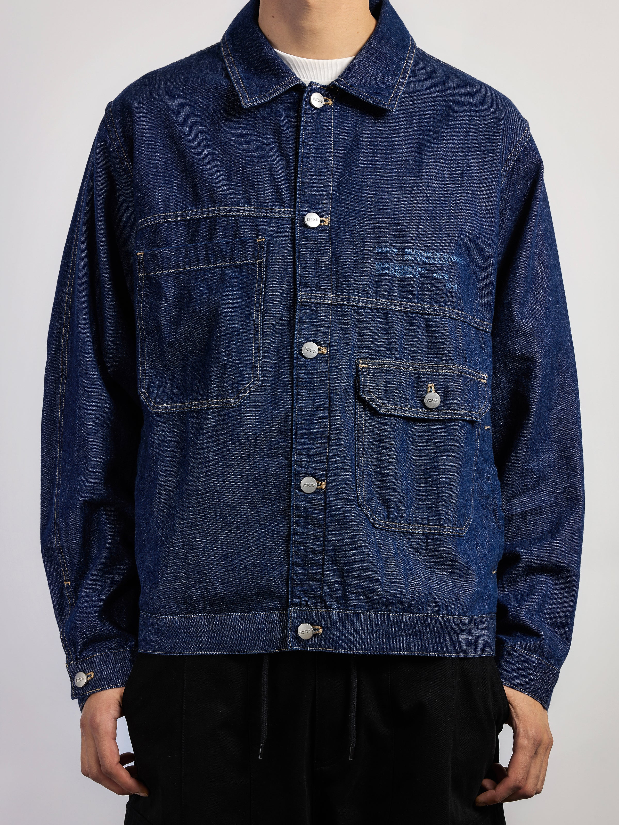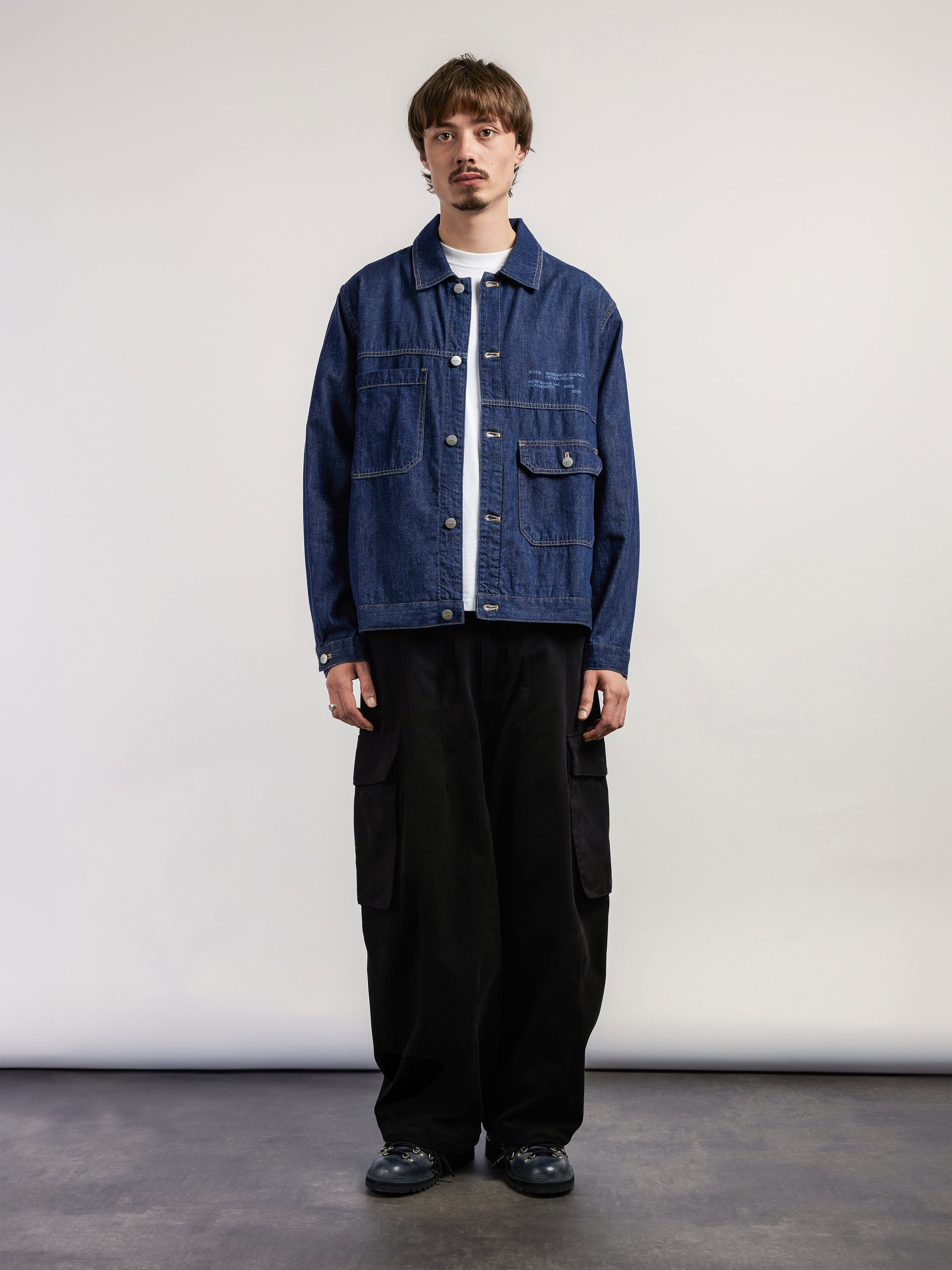The Parallax Selvedge Denim Chore is made from 8oz lightweight rinsed cotton denim. It has asymmetric sleeves, yokes, and pockets, designed to look like two separate jackets fused together, with each side fully unique. The fusion concept draws inspiration from neo-futures and science fiction, imagining hybrid and engineered garments from futuristic worlds. It is sewn with traditional tobacco-coloured contrast stitching and finished with SCRT® branded shank buttons.